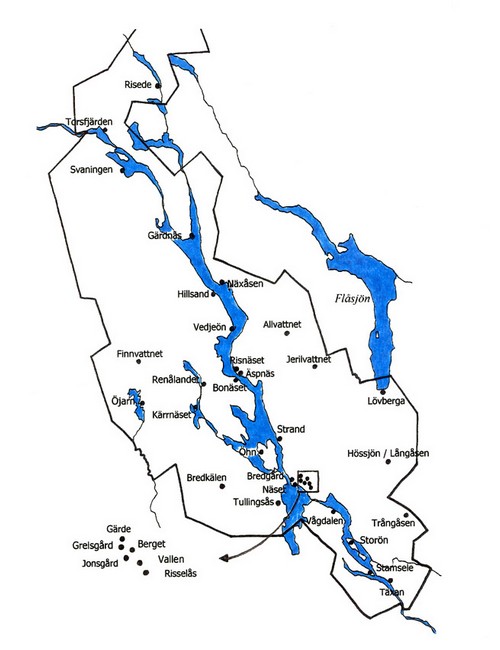 öster om Vattudalen: Strand Långåsen Lövberga Äspnäs Alavattnet Järilvattnet Näxåsen Gärdnäs Risede Torsfjärden |