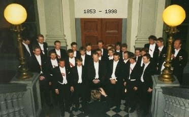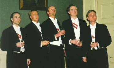 | Välkomstsånger i Stora Trappan, Norrlands Nation. Stekta harar gödda svin, kyckling sill och brännevin på bordet är, var god stig in! |