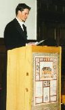 | Jubileumsutställningen visas för gästerna av utställningskommissarien med tillhörande mässning: Här är handskrivna noter till en manskörssång som sjöngs på nationen redan 1827 ...bl a ... bl a ....... |
