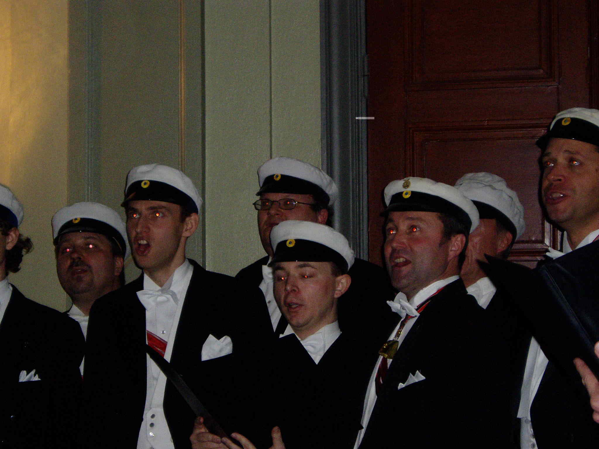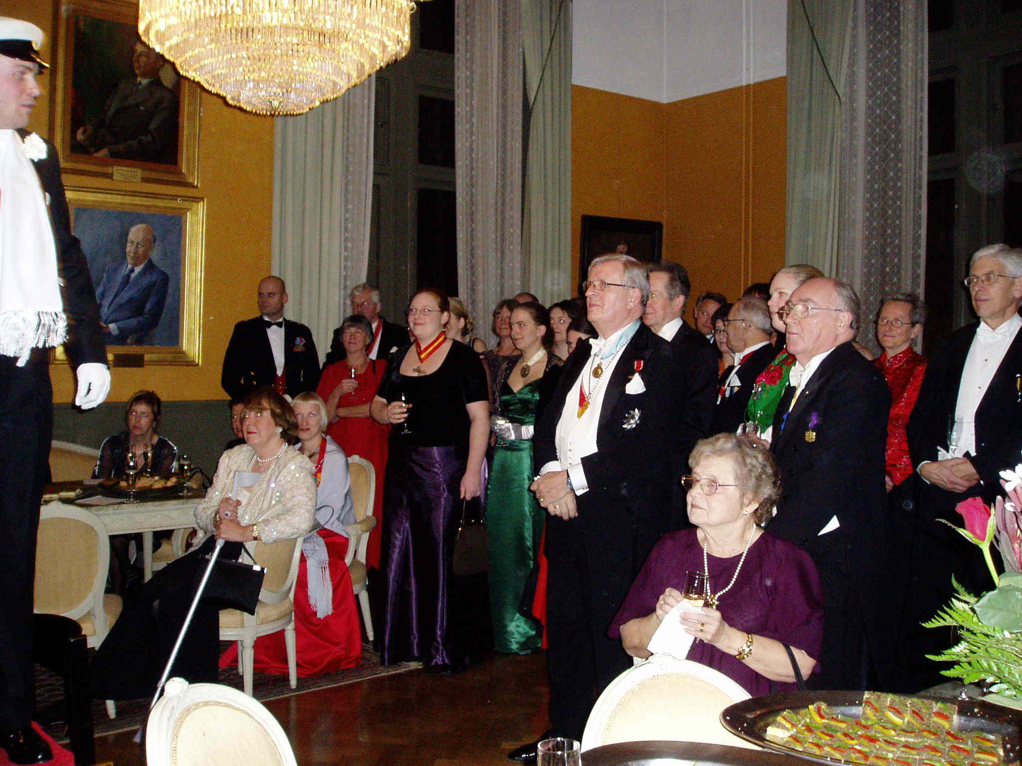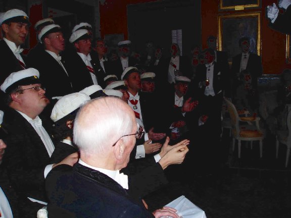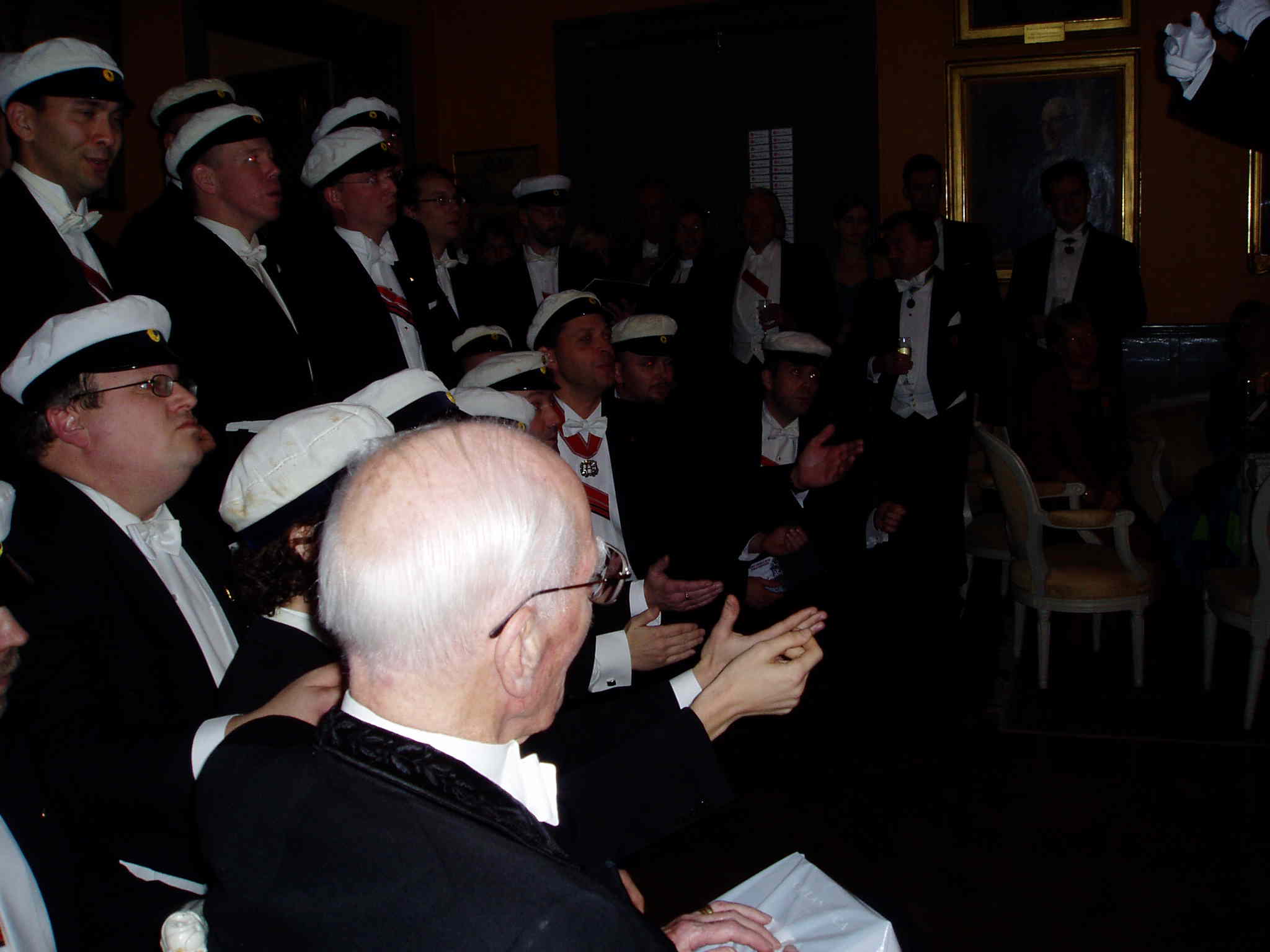 Konsert i Gula Salongen. Till Fru Inspektor em.: Ko-om du lju-uva, hjärte-vän... Notera: t v Carl-Martin Edsman, nationens äldste Inspektor+1Q em. f.1911(!) Stor bild |