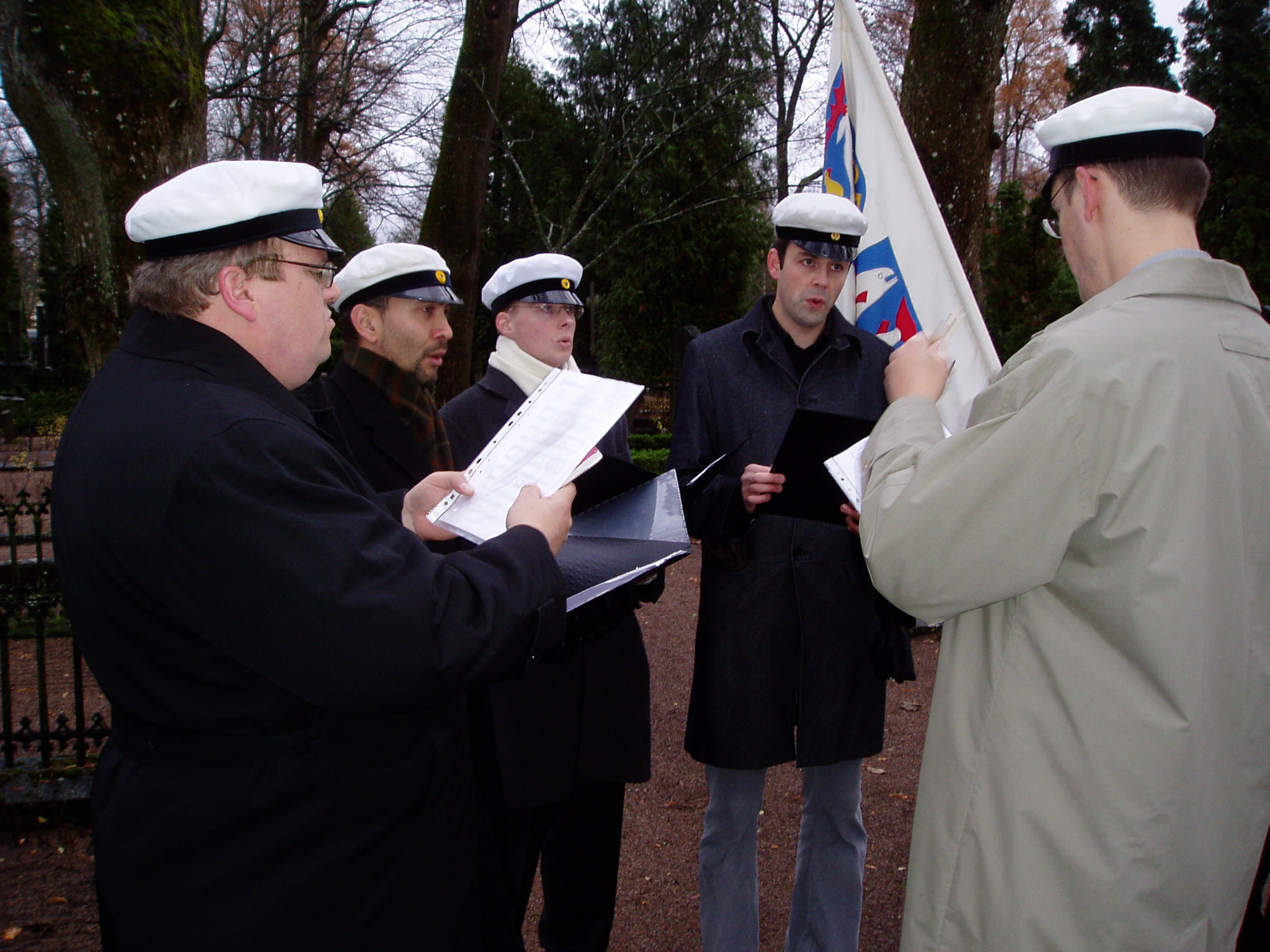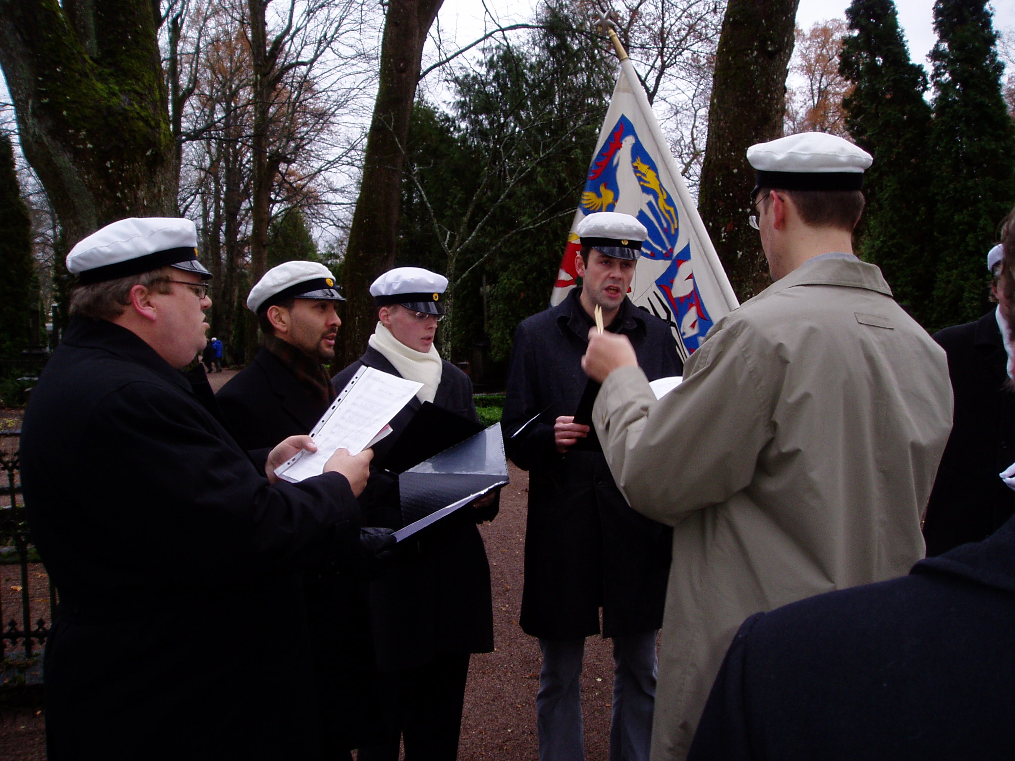 Norrlands nationsgrav - 6 november 2004Traditionsenligt marscherade nationens ledning med fanbäraren i täten till Gamla kyrkogårdenför Allhelgonahögtiden med kransnedläggning. Likaledes traditionsenligt sjöng en kvartett ur CV under ledning av vCVD emeritus Johan Bergsten.