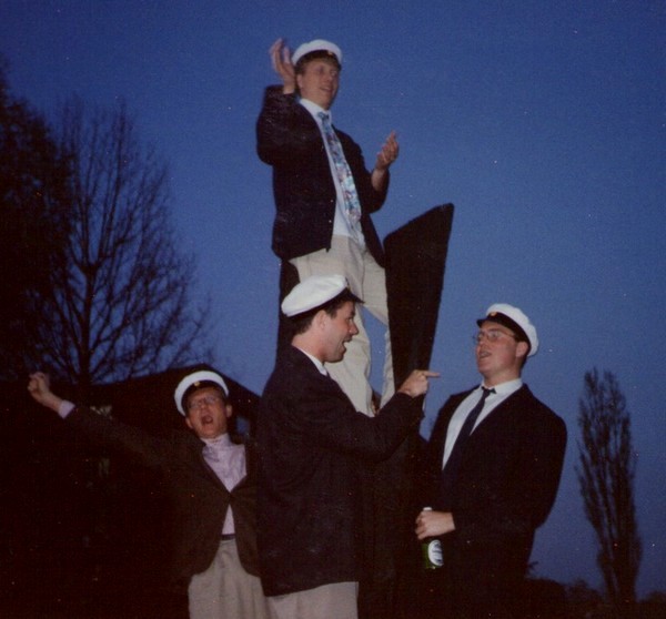 Traditionell avslutning vid statyn på Studentvägen 20/26. Dirigenten Mikael Nehrer på toppen.
