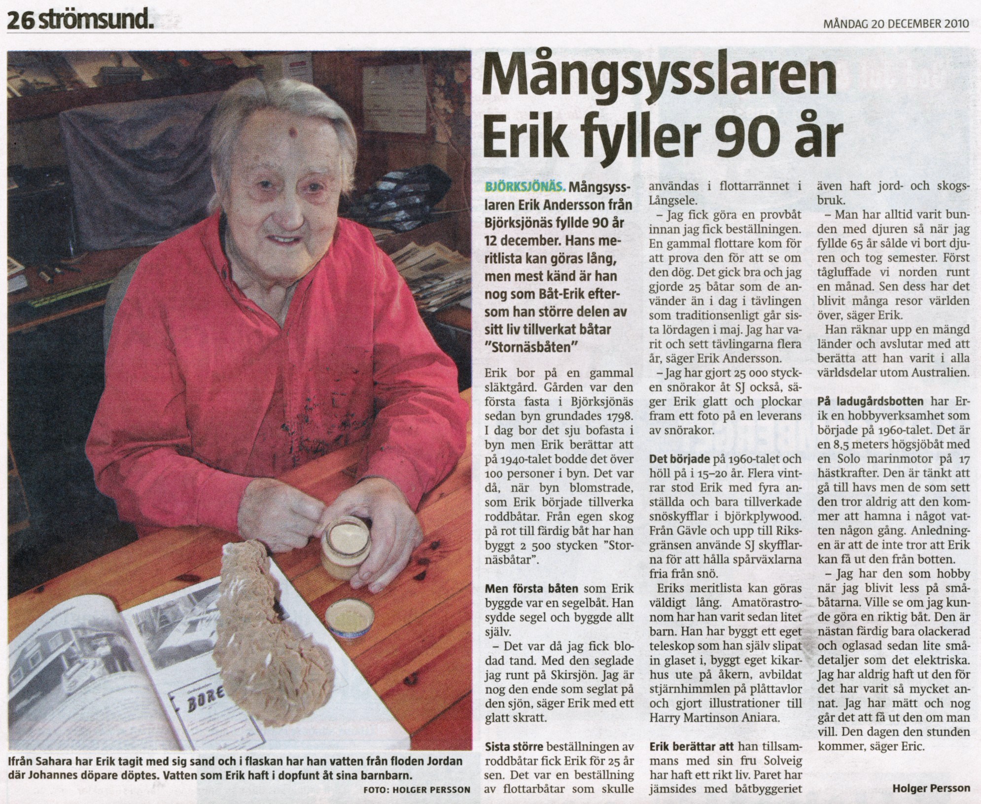 - ur ÖP den 16 oktober 2000: Erik, 80 år, har byggt träbåtar i 52 år och har inga planer på att slutaAndersson & Son Båtbyggeri har 52 år på nacken. Erik har varit med från starten på 1940-talet när det var ett sådant sug efter båtarna att de lämnade snickeriet innan färgen hunnit torka, och han bygger fortfarande omkring tio båtar varje år.I 52 år har Erik Andersson från Björksjönäs byggt båtar i trä och än tänker han inte sluta. - Man måste ju ha något att göra, säger 80-åringen som knappt har en båt klar innan han börjar hyvla på kölen till nästa.