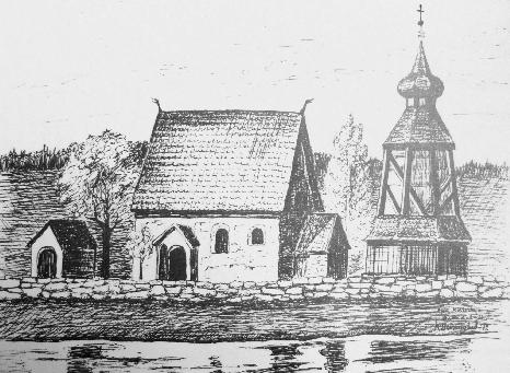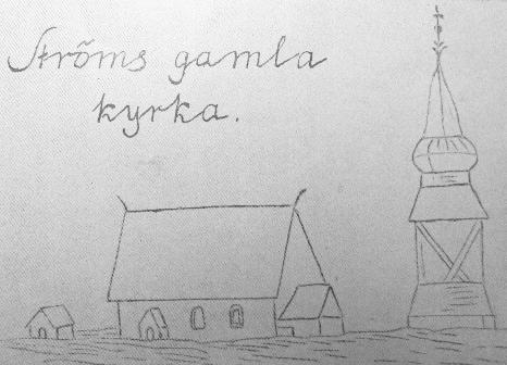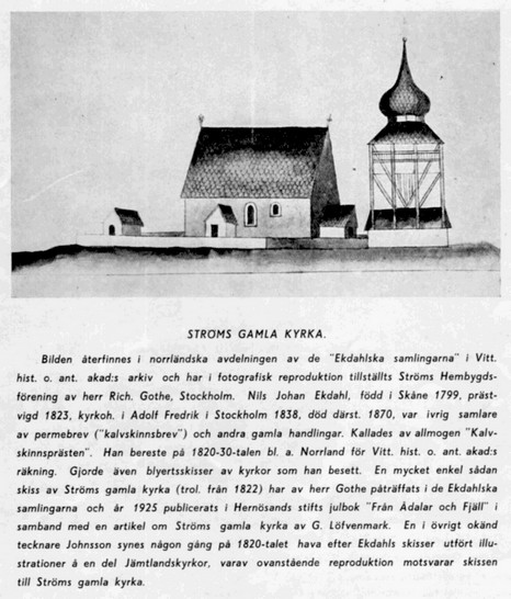 ![]() Ströms gamla kyrka från söder, efter originalteckning av prästen Nils Johan Ekdahl 1822. Ströms medeltida kyrkaI de gamla handlingarna från alltinget i Sveg år 1273, för de då norska landskapen Jämtland och Härjedalen, nämns namnet Ström för första gången i skrift. Vid tinget avhandlades bl a riksgränsen mellan Norge och Sverige, och där vittnade en gammal bonde, "Loden bonde", att han som ung hade deltagit i den då senaste gränskommissionen. Den passerade förmodligen Ström omkring år 1240. I texten sägs följande:ok kuazst Loden bonde muna, the er hann fotfor thetta ramerki, at tha kunni enge madr pater noster i StraumiKristendomen hade alltså vid denna tid inte rotat sig djupare i den jämtländska skogsbygden, långt från den 200 år tidigare kristnade centralbygden på Frösön, än att man inte kunde läsa den kristna centralbönen. Exakt när kyrkan byggdes vet man inte, det måste ha skett mellan 1273 och 1314, förmodligen kort före sekelskiftet 1300. År 1314 nämns Hammerdals församling som "Hambradal cum annexa"; Hammerdal med annexförsamling, dvs Ström, bland de socknar i Jämtland som bidrog till en sexårsinsamling till påven. Ström var sedan under hela medeltiden och ända fram till 1873 annexförsamling till Hammerdal. När kyrkan byggdes fanns det enligt traditionen endast sju gårdar i hela Ströms socken. Sägnen berättar att man först tänkt bygga kyrkan vid Bredmon, intill nuvarande Tännviken, men vittran och annat oknytt förhindrade hela tiden bygget, och man byggde i stället vid den s k "Kråkvågen" sedan man låtit en stock med en inhuggen yxa flyta ut i Russfjärden för att visa den rätta platsen att bygga kyrkan. År 1818 fattades beslut av Ströms sockenstämma att bygga en ny större kyrka, och en första grund gjordes år 1823. Det dröjde dock ända till 1847 innan den nya kyrkan kunde invigas. Den sista högmässan i Ströms gamla kyrka hölls år 1848, och därefter revs kyrkan i omgångar och användes som byggnadsmaterial på gårdarna runt Vattudalen. De sista resterna av kyrkans grund schaktades bort så sent som 1885. Ett altarskåp från 1400-talet finns bevarat från den gamla kyrkan på den nya kyrkans södra långvägg, och även en altaruppsats från 1759.