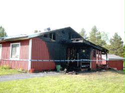 Efter branden är ena halvan av fastigheten i praktiken totalförstörd. De två personer som vistades i den brandskadade bostaden kunde själva sätta sig i säkerhet. Foto: Holger Persson |