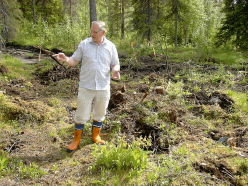 Den sällsynta guckuskon finns på få platser i landet. I Tjädernäset fanns ett rikligt bestånd som av misstag har massakrerats av skogsmaskiner. Här beskådar Curt Svahn förödelsen. Foto: Holger Persson |