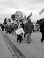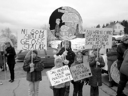 Kommunals knattingar bildade nära nog ett eget demonstrationståg i Hammerdal. Foto: Holger Persson Det var barnen och deras krav som satte lite extra färg på demonstrationen i Hammerdal. Här gäller det läkarsituationen i Backe. Foto: Holger Persson |