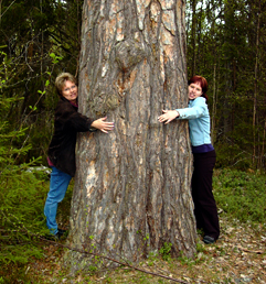 Marita och Sofie Persson försöker omfamna den gamla tallen,