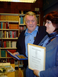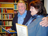 Strömsunds kultur- och fritidsnämnds ordförande Lena Johansson hade nöjet att inför ett fullsatt bibliotek på tisdagskvällen få tilldela författaren Per Gunnar Evander årets Hedenvind-plakett. Foto: Holger Persson |