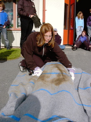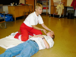 Lisa Larsson från Röda korset visade hur man gör för att få fria luftvägar på en medvetslös person. Modell är Jonas Ingelsson. Theres Eriksson fick lära sig hur man kväver eld på en