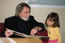 på Ströms Hembygdsgård. Foto: Holger Persson Per Åhlin skriver en hälsning i boken Dunderklumpen till 3-åriga Ollvia Jhalagamage innan hon ska se teatern.