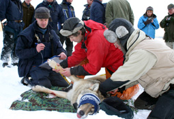 När vargen var sövd transporterades den till Ringvattnet och visades upp för byborna. Foto. Holger Persson |