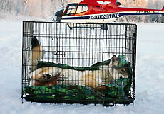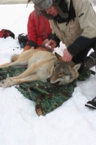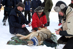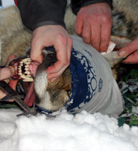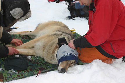 Peter Segerström från projektet Järv & lo fäster pejlingshalsbandet på vargen utanför Ringvattnet i går. Foto: Holger Persson