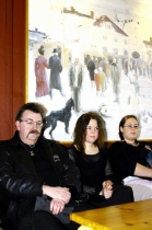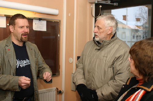 Gert Norman samtalade med Enar Jonasson och Alma Pihl Eriksson, som tillsammans med Annette Wikström i går överlämnade protestlistan till kommunalrådet i Strömsund.Foto: Holger Persson |