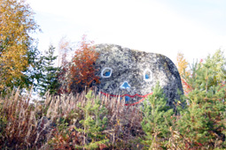 ÖP 2005-10-26 Det finns trafiktroll som bevakar trafikanterna. Åker ni 45:an och närmar er Lövberga söderifrån så var uppmärksam. Det här glada stentrollet har bosatt sig där. Och med tanke på att det enbart är trollets huvud som syns så får man med fantasin fundera över dess storlek om det skulle resa på sig. |