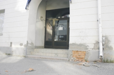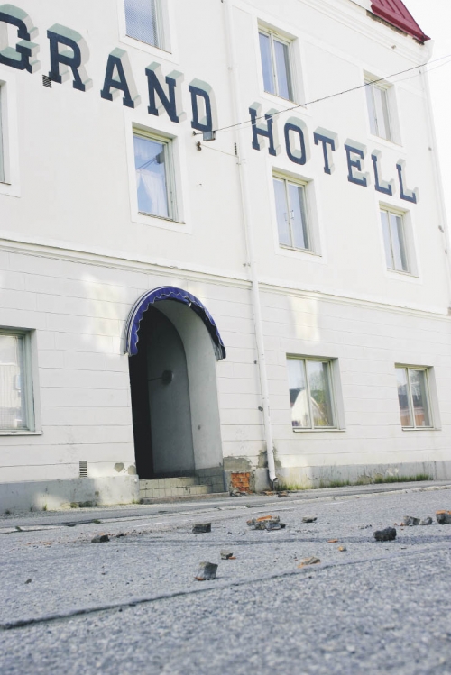 Den senaste tiden har puts och stenar lossnat från Grand Hotells fasad. Det som förr var ett levande hotell är nu nästan ett ödehus. Foto: Holger Persson Foto: Holger Persson |