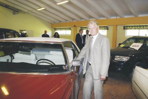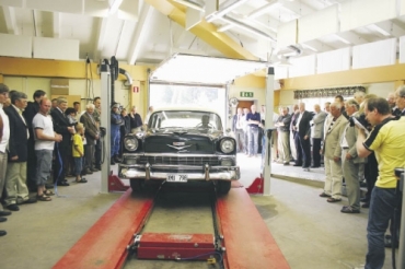 Många hade samlats för att beskåda invigningen. Besiktningsman Eiron Persson, Hammerdal demonstrerar hur man rattar upp ett fordon för kontroll. Foto: Holger Persson Magnus Ehrenstråhle, vd bilprovningen, överlämnar en gåva åt Ivar Eriksson vid invigningen. Olov Johansson beundrade de äldre bilarna som fanns på plats. |