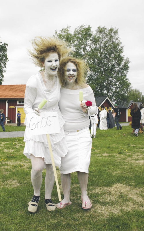 Caroline Sjöberg och Johanna Landin, Vattudalsskolan 9 D2 försöker skrämmas. Foto: Holger Persson Mellan 350 och 400 deltagare i karnevalen från 16 klasser. |