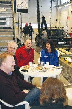 Kåre Andersson, Göran Edman, Jan-Olof Andersson och Bilprovnings kund Märta Eriksson samtalar medan hennes bil kollas. Text/Foto: Holger Persson |