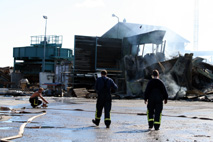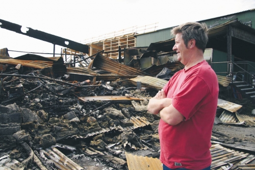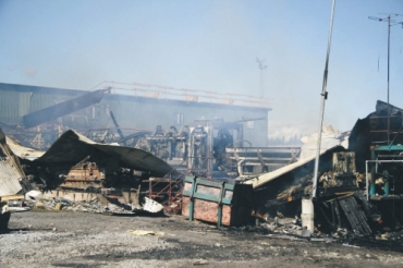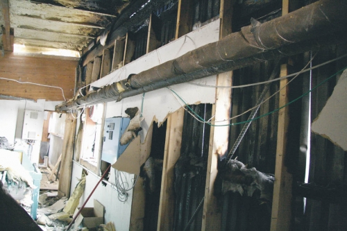 Håkan Jakobsson ledde redan projektet för att modernisera sågen i Sikås. "Jag får inte direkt mera jobb på grund av branden. Däremot blir det utdraget över en längre tid. Förmodligen blir driftsstoppet tre månader längre än beräknat", säger han. Torbjörn Olsson har just varit på semester i Danmark. När han kom hem i går låg hans arbetsplats i spillror. Hit nådde branden. På grund av att det var utröjt bakom den här väggen fungerade glappet som en brandgata. Så fort försäkringsbolaget sagt sitt börjar uppbyggnaden av en ny såg. Foto: Holger Persson. |