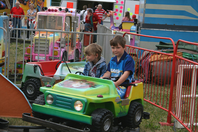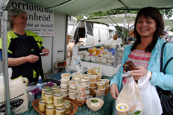 Humöret är på topp både bland knallar och kunder. Lena Emilsson gör ett impulsköp av ost och tunnbröd hos Marie Hansson. Måns och Max Ågevall trivdes bättre på tivolit och karusellerna än att ströva runt bland marknadsstånden. Text/Foto: Holger Persson |