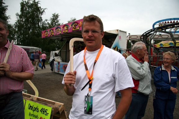 Ola Sonidsson går runt och samtalar med besökare och knallar. Här provar han Smärtkroken som ska vara bra att använda på onda ryggar. Foto: Holger Persson |