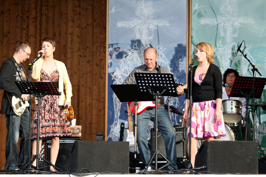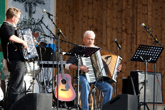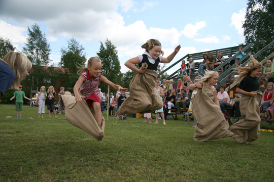 Det blev jämt och spännande i säckhoppningen, så jämt att vissa lopp fick köras om för att kora vinnare. För Ida Olofsson, som här hoppar högst, var det första gången hon provade säckhoppning. -Det var kul, tyckte hon. Husbandet Norrland och Tjejgruppen LEIJ som framförde både eget och andras låtar vid Strömskväll. Jularbo spelarnaTommy Strömqvist och Hans-Göran Rångefors drog förstås Drömmen om Elin. Text/Foto: Holger Persson |