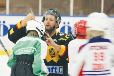 Simon Eriksson får Mikael Renbergs autograf på sin hjälm. Foto: Holger Persson |