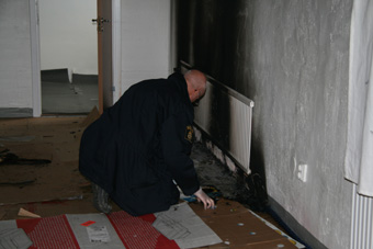 Polisens tekniker undersöker 4 brandplatsen efter attentatet. En |