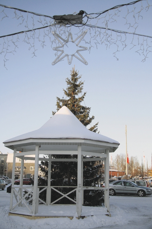 12 000 kronor kostar de två julgranarna på allmän plats för Strömsunds kommun. Belysningen i förgrunden står Helens kläder och Coop Konsum för. "Granen har jag tjatat mig till av kommunen", säger Helen Jönsson. Text/Foto: Holger Persson. |