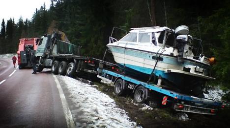 Lastbil av vägen En lastbil som var på väg till Stavanger körde vid åttatiden imorse av vägen en mil söder om Hoting. Lastbilen, som hade en båt på trailern, körde 25 meter innan den fick stopp. Ingen människa skadades vid olyckan. |