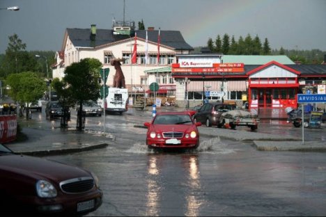 Ett rejält åskväder drog förbi Strömsund vid 17-tiden i går med efterföljande hagelskur.Det forsade vatten efter gatorna i centrala Strömsund när dagvattenbrunnarna inte tog undan. Vid flera brunnar stod vattenstrålen högt. Ovädret orsakade även översvämning. En butik fick exempelvis vattenskador efter att vatten runnit in. Text/Foto: Holger Persson. |