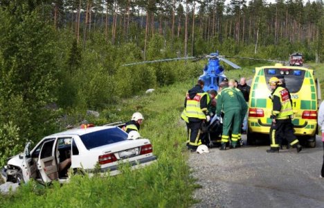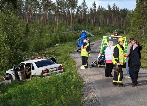 En singelolycka inträffade i Strömsunds kommun på lördagskvällen vid 19-tiden. Olyckan inträffade på en grusväg. Två personer färdades i bilen som fick sladd och åkte av vägen i en skarp högerkurva. Föraren fördes till Östersunds sjukhus i ambulanshelikopter. Foto: Holger Persson |