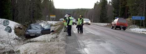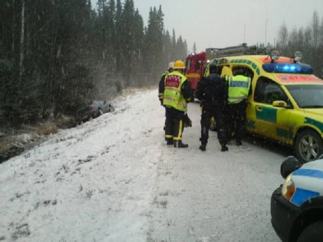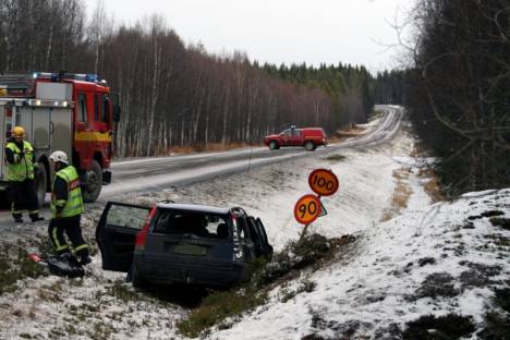 och Lövberga. En bil på väg söderut snurrade runt på den hala vägen och åkte med bakdelen ner i diket och in i en jordvall. Kvinnan som körde tog sig själv ur bilen men fraktades med ambulans till hälsocentralen i Strömsund för rutinkontroll. |