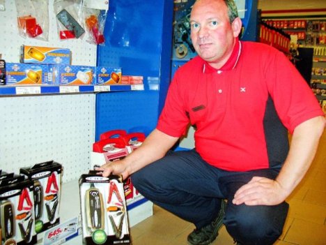 Chefen på OKQ8, Raymond Berglin, visar upp vilken sorts batteriladdare som stulits. Foto: Holger Persson. |