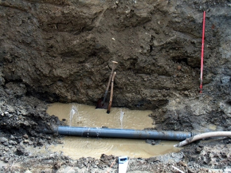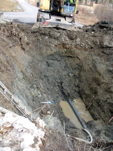 Vattenläckan i Strömsund är lokaliserad och ledningen ska bytas under dagen. Läckan är av större format och det går ut rikligt med vatten. Foto: Holger Persson. |