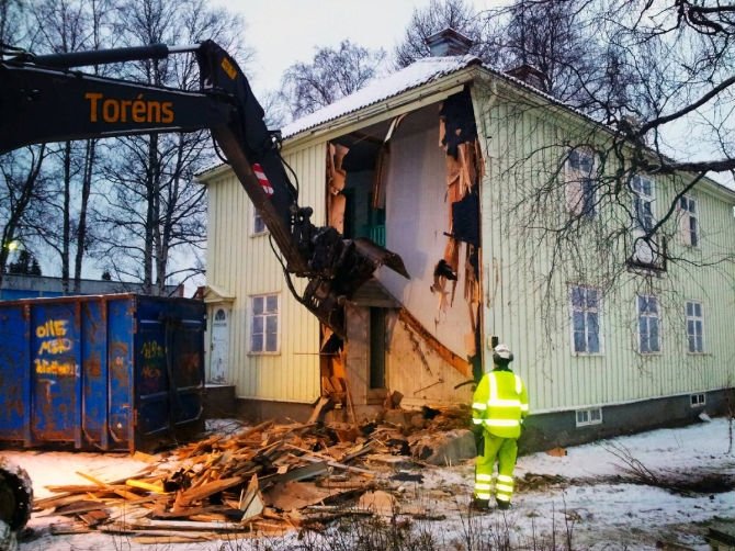 "Musikens hus" har länge varit en stark kandidat för hus som Strömsunds kommun vill riva och nu pågår rivningsarbetet för fullt. Huset fick sitt namn under den tid musicerande ungdomar repeterade där men har på senare år mest fungerat som en plats där måsarna bygger sitt bo var år. Foto: Holger Persson. |