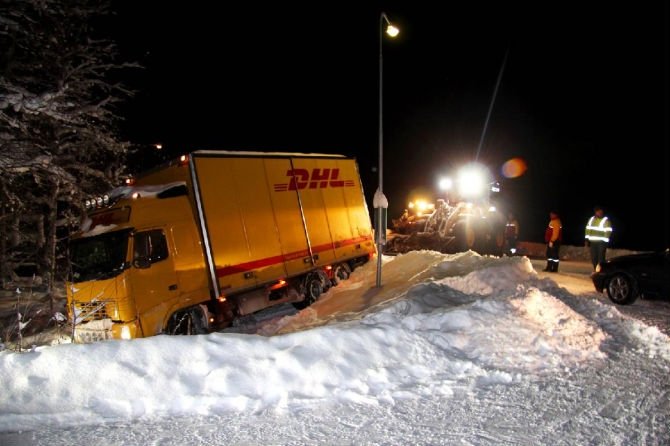 Fastän vinterväder är stabilt kan det vara fläckvis mycket halt. Vid lunchtid på torsdagen åkte en personbil av väg 345 vid bron i Ulriksfors. I mörkret vid 16-tiden for en lastbil i diket på samma ställe. Ingen person skadades vid olyckorna. Foto: Holger Persson.