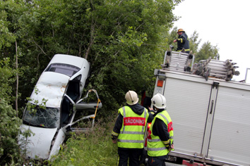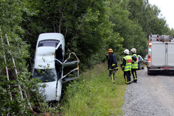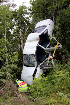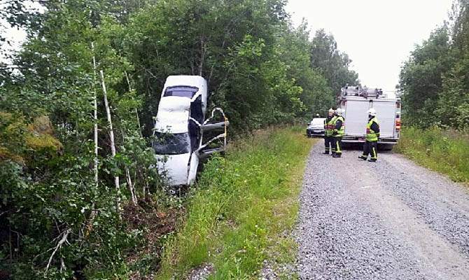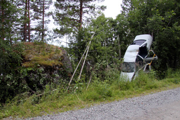 Vådlig färd gick åt skogen En bil med tre ungdomar i 20-årsåldern voltade på söndagskvällen strax utanför Strömsund. När bilen till slut stannade, gjorde den det upp och ner - mot ett träd. Foto: Holger Persson. |
