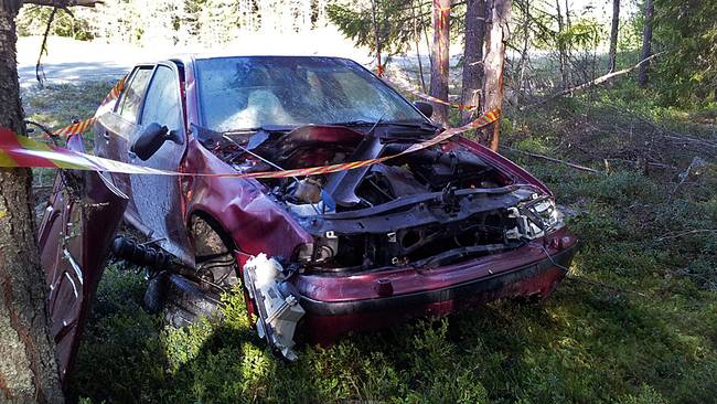 Räddningstjänsten kunde få upp bildörrarna så att bilföraren till slut kunde ta sig ut. Foto: Holger Persson |