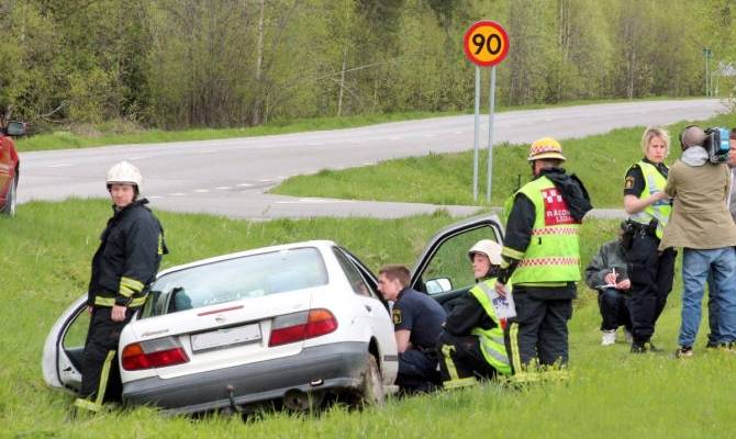 Fyra personer fördes i ambulanshelikopter till sjukhus efter en singelolycka på väg 345 i Morse. Foto: Holger Persson. |